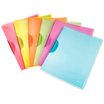 Paquete de 6 carpetas de colores A4 ColorClip en varios colores, capacidad para hasta 30 hojas A4, ideal para el transporte, presentación y organización de documentos sin perforar, para escuela, hogar u oficina. Clip giratorio de plástico para una fácil sujeción y fijación de papeles, la cubierta frontal se mantiene plana cuando se abre, excelente para presentar materiales profesionales. Mezcla y combina con otros productos Leitz A4. Plástico duradero y resistente al desgarro, el paquete surtido contiene 6 limas translúcidas con 1 amarillo, 1 rojo, 1 azul claro, 1 naranja, 1 morado y 1 clip de columpio verde. Contenido del envío: 1 paquete de 6 limas Leitz A4 ColorClip Rainbow, capacidad de 30 hojas, plástico flexible, dimensiones (ancho x alto x profundidad): 222 x 5 x 310 mm, varios colo