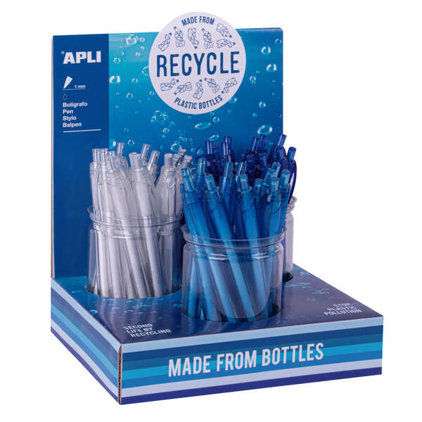 Apli Boligrafo Ecologico - Punta de 1mm - Fabricado con 80% Pet Reciclado - Expositor con 36 Unidades en 3 Colores