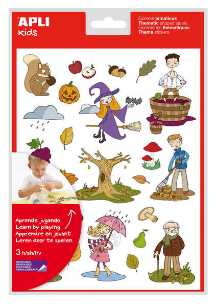 Apli Bolsa de Gomets Tematicos el Otoño - 72 Gomets en 3 Hojas - Adhesivo Removible - Ilustraciones Educativas - Adhesivo Base Agua - Libre de Disolventes - Coloridos