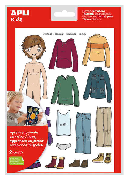 Apli Bolsa de Gomets Tematicos Vestirse Niño - 35 Gomets - Adhesivo Removible - Desarrollados con Educadores - Normas EN-71 y FSC - Adhesivo Base Agua - Libre de Disolventes - ECF - 100% Reciclables - Colorido
