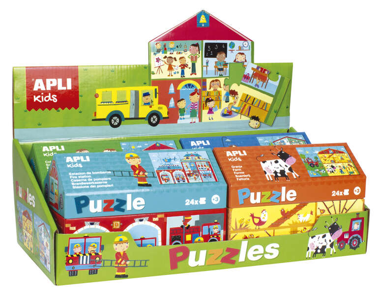 - Cada expositor contiene 4 puzles (1 de cada diseño): la casa, el colegio, la estación de bomberos y la granja.