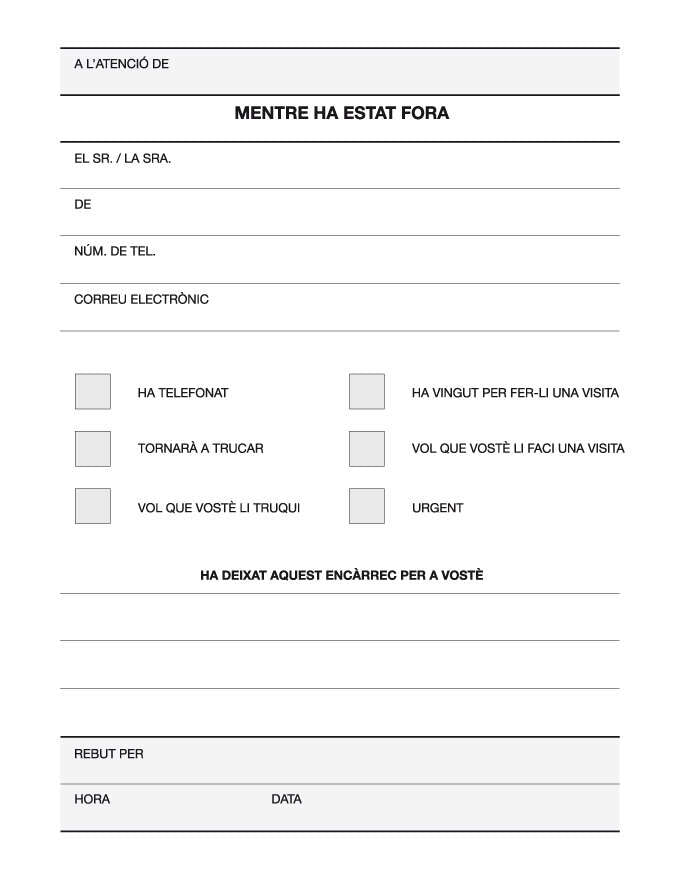 Con un formato vertical de 1/8 y texto en catalán, este talonario está diseñado para facilitar la tarea de registro y seguimiento de llamadas.
