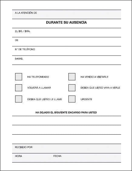 - Espacio para anotar fecha, hora, número de teléfono, nombre del interlocutor y motivo de la llamada.