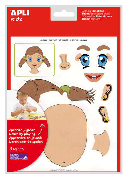 Este tipo de gomets, desarrollados con la colaboración de educadores, ayudan a los niños a identificar las diferentes partes de la cara colocando las distintas partes en el lugar apropiado.