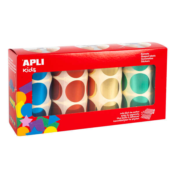 Apli Pack de 2.256 Gomets Redondos Ø 33mm - 4 Rollos de 564 Gomets - Adhesivo Permanente - Ideal para escuelas Infantiles y Colegios - Colores Metalizados Surtidos