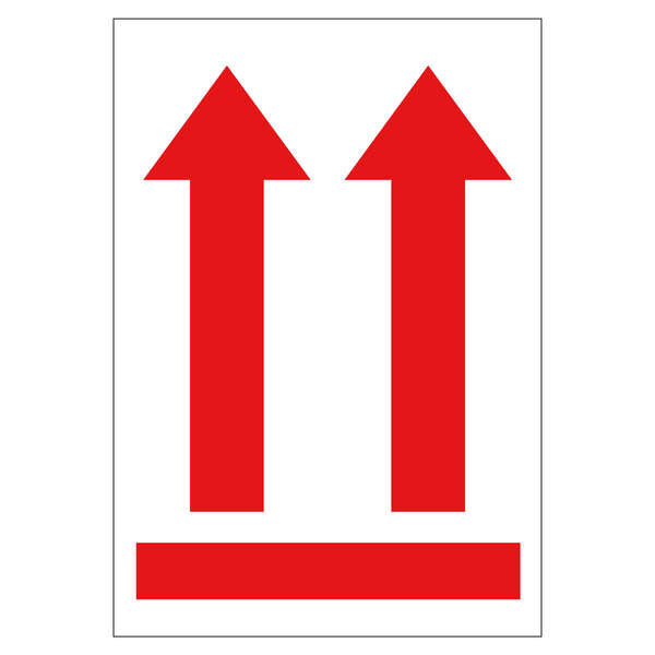 Etiquetas adhesivas en rollo con flechas preimpresas para indicar la posición vertical del paquete, tamaño 90 x 130 mm.