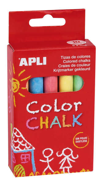 Apli Tizas Redondas de Colores Surtidos - Pack de 10 Tizas de Ø 9 x 80mm - sin Polvo - Ideales para Escribir, Dibujar y Colorear en Pizarras y Pavimentos - Aptas para Uso Escolar