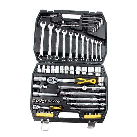 El conjunto de herramientas incluye una variedad de llaves de vaso articuladas, llaves combinadas, vasos de diferentes tamaños, barras de extensión, adaptadores, una articulación universal, un mango corredizo T, una chicharra con expulsor de vasos, puntas de destornillador de diferentes tipos (plana, estrella, estrella doble, Tor, Allen), y llaves hexagonales.