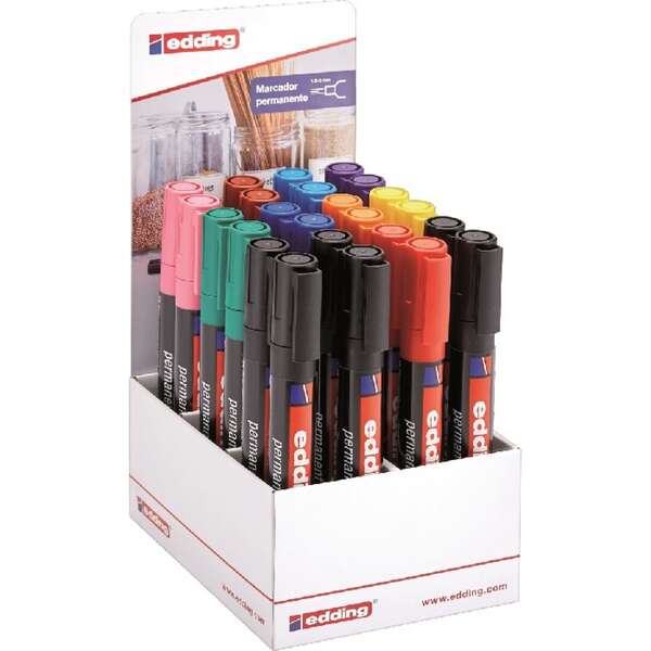 edding 300 marcador permanente, el comodín polifacético. Si estás buscando una solución versátil para poder organizarte mejor las tareas domésticas del día a día, no te lo pienses más. Tanto si planeas rotular carpetas, fiambreras o botellas de cristal, el edding 300 marcador permanente va bien sobre casi cualquier material. Además, la punta redonda permite distribuir la tinta de manera uniforme. El práctico clip evita que el rotulador ruede y permite fijarlo a ropa y otros objetos. Este edding duradero, a prueba de borrones y resistente al desgaste está disponible en una 10 colores, y puede utilizarse por igual sobre plástico, madera, metal, vidrio o cartón. Rellenable en los colores negro, rojo, azul y verde con la tinta de recarga edding MTK 25. Tinta casi inodora y sin adición de tolueno o xileno Es el asistente idóneo para tus tareas diarias. Características: -Forma de la Punta: punta redonda -Grosor de trazo: 1.5 - 3 mm -Permanente -Tinta casi inodora -Resistente al Agua -Resistente al Desgaste -Resistencia al Roce -Rellenable -Capuchón con clip, puede reposicionarse. -Fluorescente -Secado rápido -Expositor de 24uds.