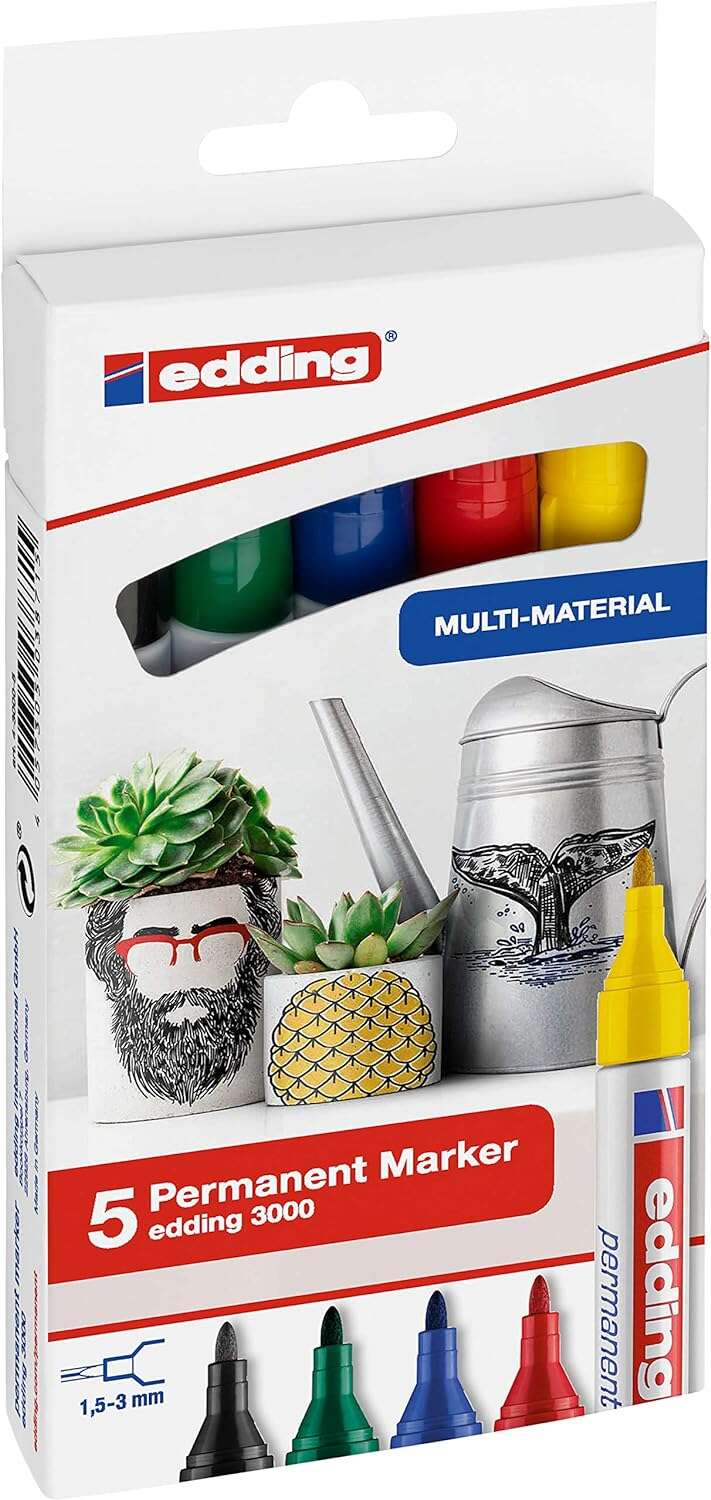 Edding 3000 Pack de 5 Rotuladores Permanentes - Punta Redonda de 1.5mm - Trazo entre 1.5 y 3mm - Recargable - Secado Rapido - Color Surtidos