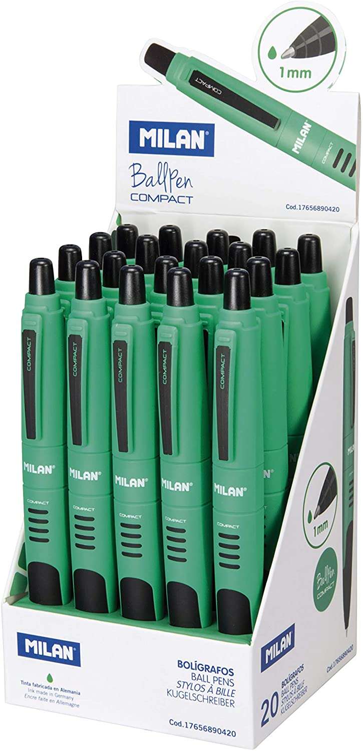 Milan Compact Expositor de 20 Boligrafos de Bola Retractiles - Punta Redonda 1mm - Cuerpo Verde/Negro - Color Verde