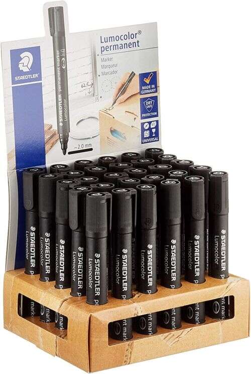 Staedtler Lumocolor 352 Expositor de 30 Rotuladores Permanentes - Punta Redonda - Trazo 2mm Aprox - Capuchon con Clip - Secado Rapido - Color Negro - Cantidad: 30