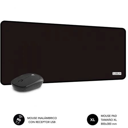 Subblim Pack Harmony Alfombrilla de Escritorio 800x300x2mm, Bordes Reforzados, Base Antideslizante + Raton Inalambrico 1200dpi, 3 Botones - Color Negro
